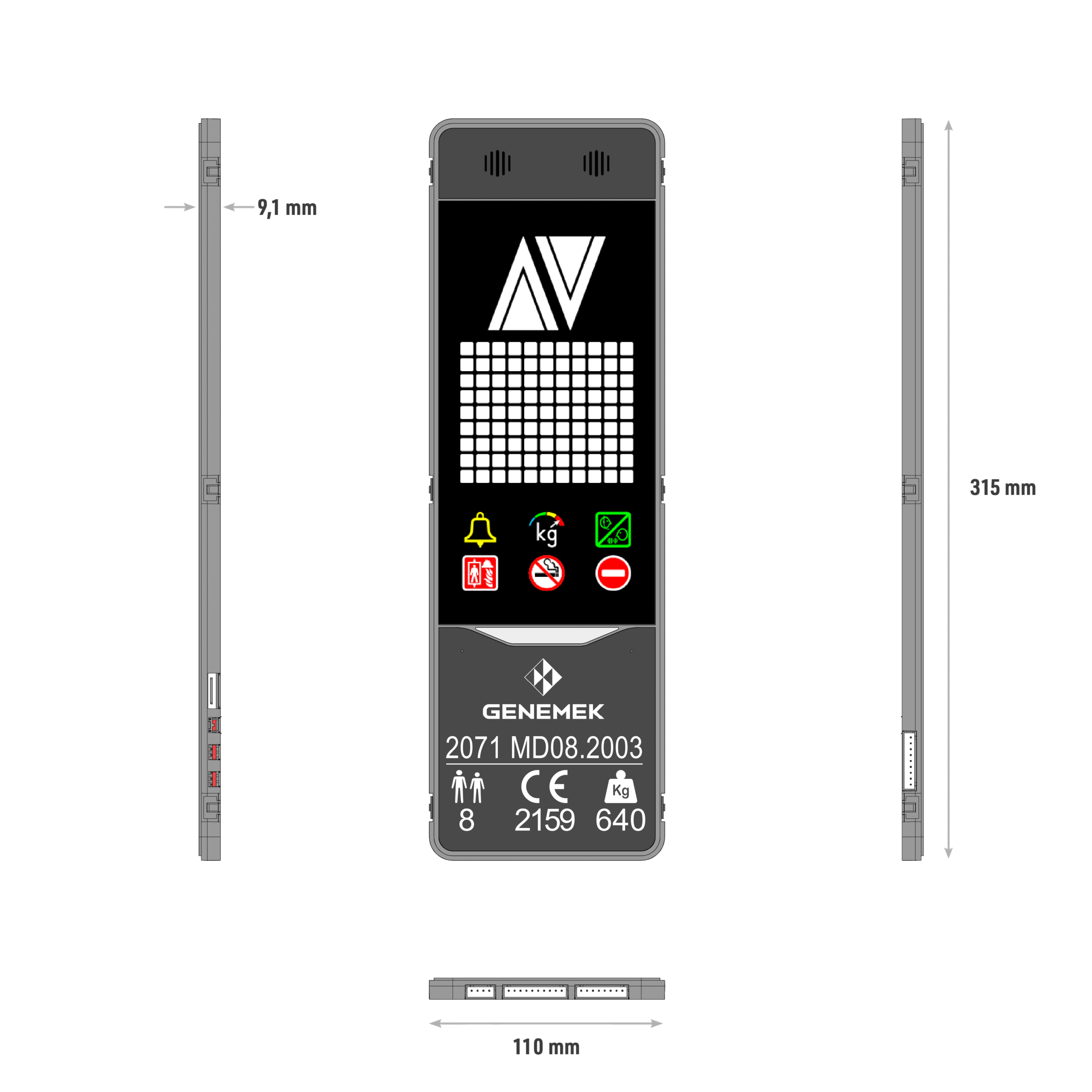MEGA5 is brand new all in one elevator floor position indicator solution. 11×7 LED matrix display, Compatible with ANTERA and AVOX/HVAT car operator panels. The compact design of the indicator module has all the neccesary components to comply with EN81-20, EN81-28, EN81-70 standards.